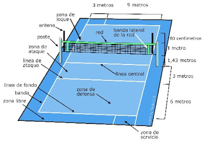 La primera cancha de Voleibol tenia las siguientes medidas: 15,24 m de largo y 7,62 m de ancho. La red tenia un ancho de 0,61 m. El largo era de 8,235 m, siendo su altura de 1,98 m (desde el piso hasta el borde superior). La pelota era una cámara de goma con cuero a su alrededor o lona de color clara y tenía una circunferencia de 63,7 hasta 68,6 cm. Su peso era de 252 hasta 336 g.